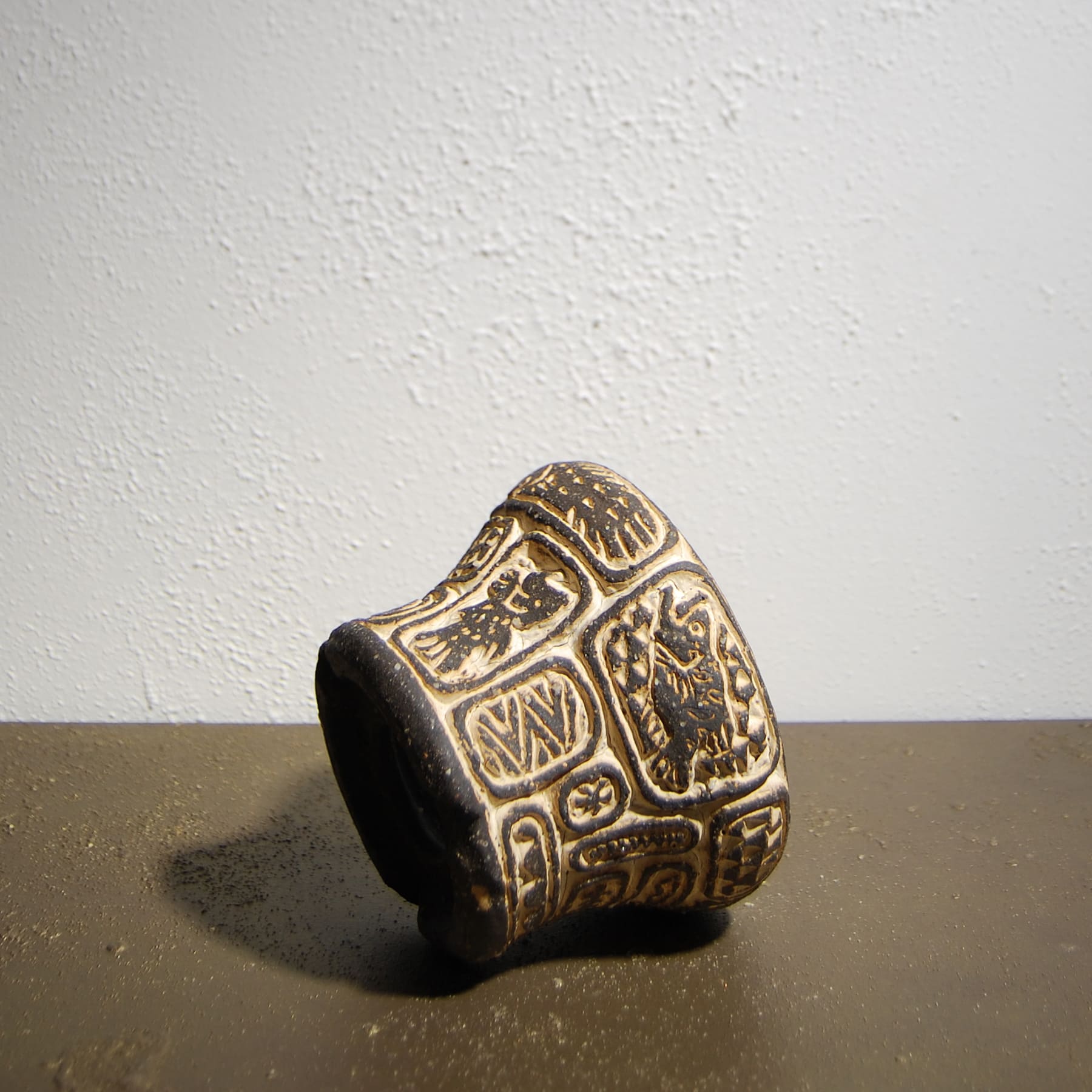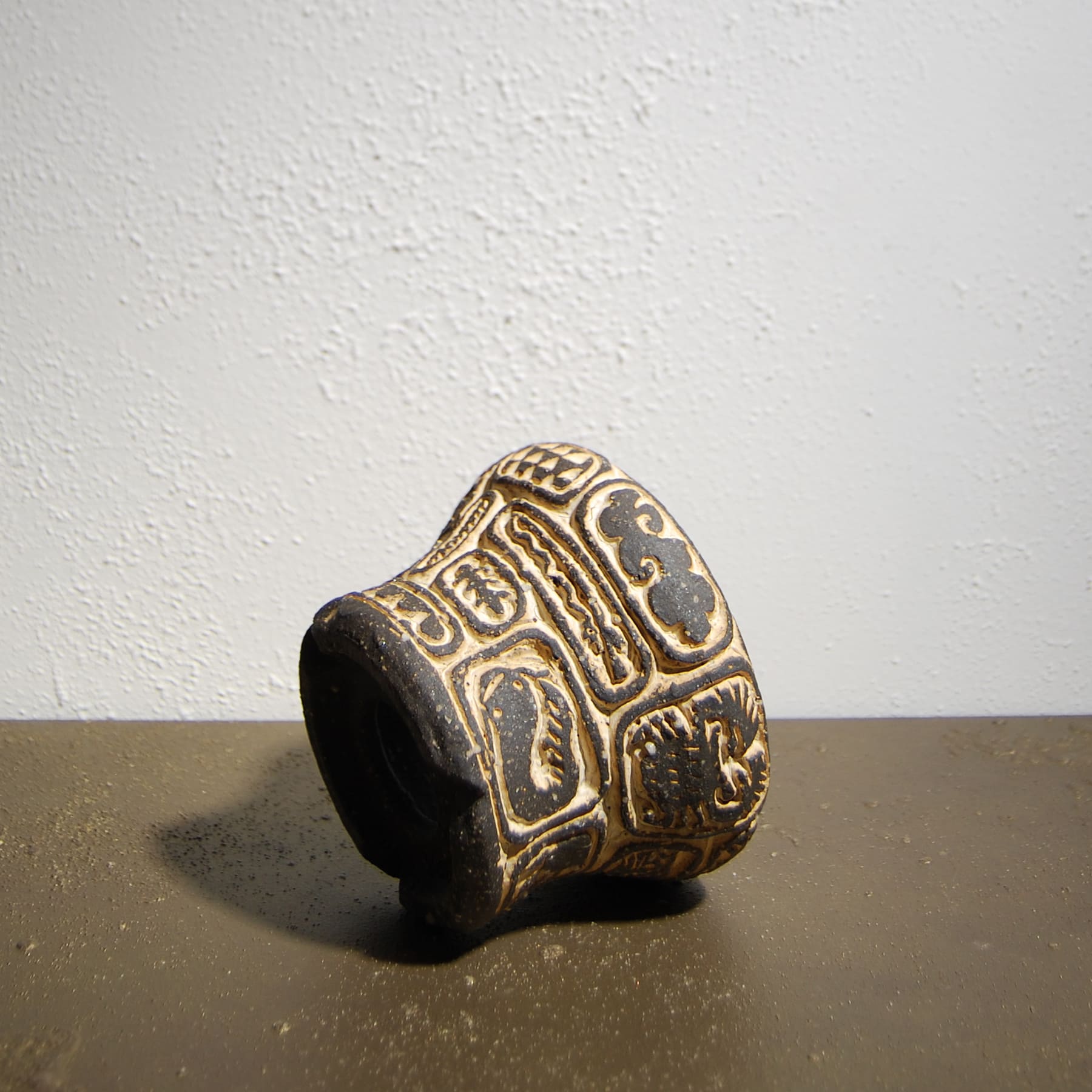 柄や文様は、成型した粘土に一つ一つ手で柄を彫り込み、そこに白い土を埋め込む「象嵌(ぞうがん)」という技法で刻まれています。