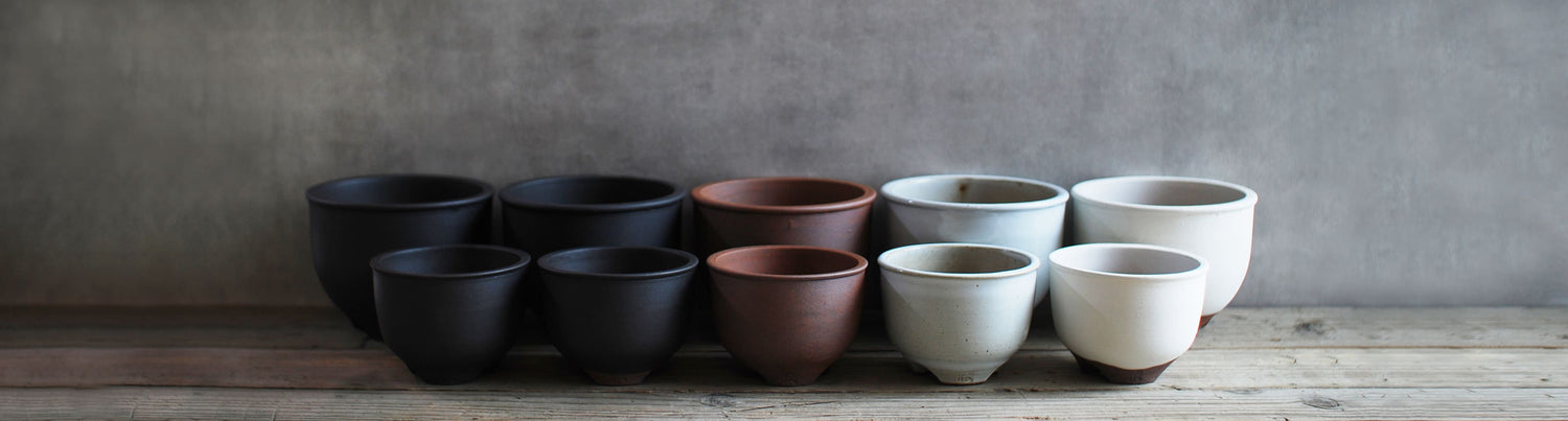 代表的なコウロ型(サクラソウ型)をはじめ、丸型、シャジン型、大道型などシンプルで洗練された形状の植木鉢は様々な植物と合わせやすく、生産者からの評価も高く、愛好家の間でも支持され続けています。