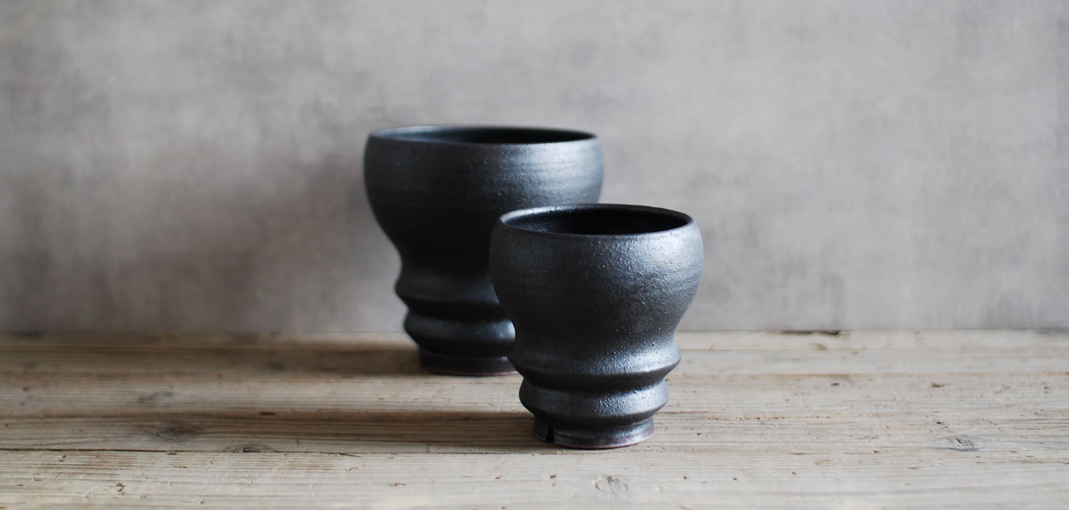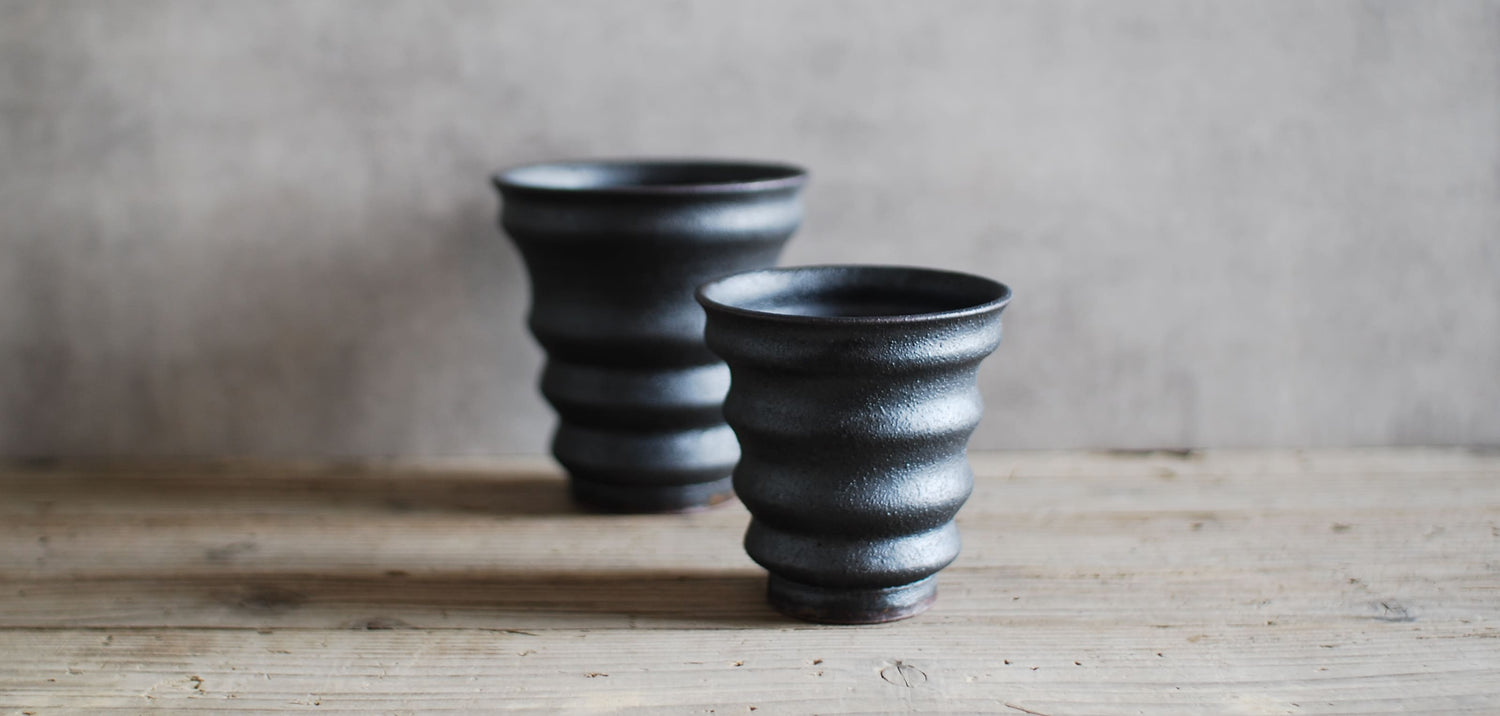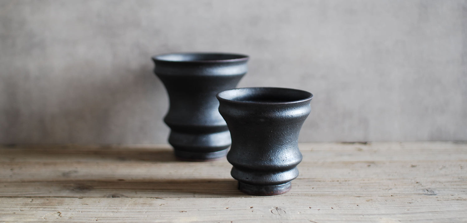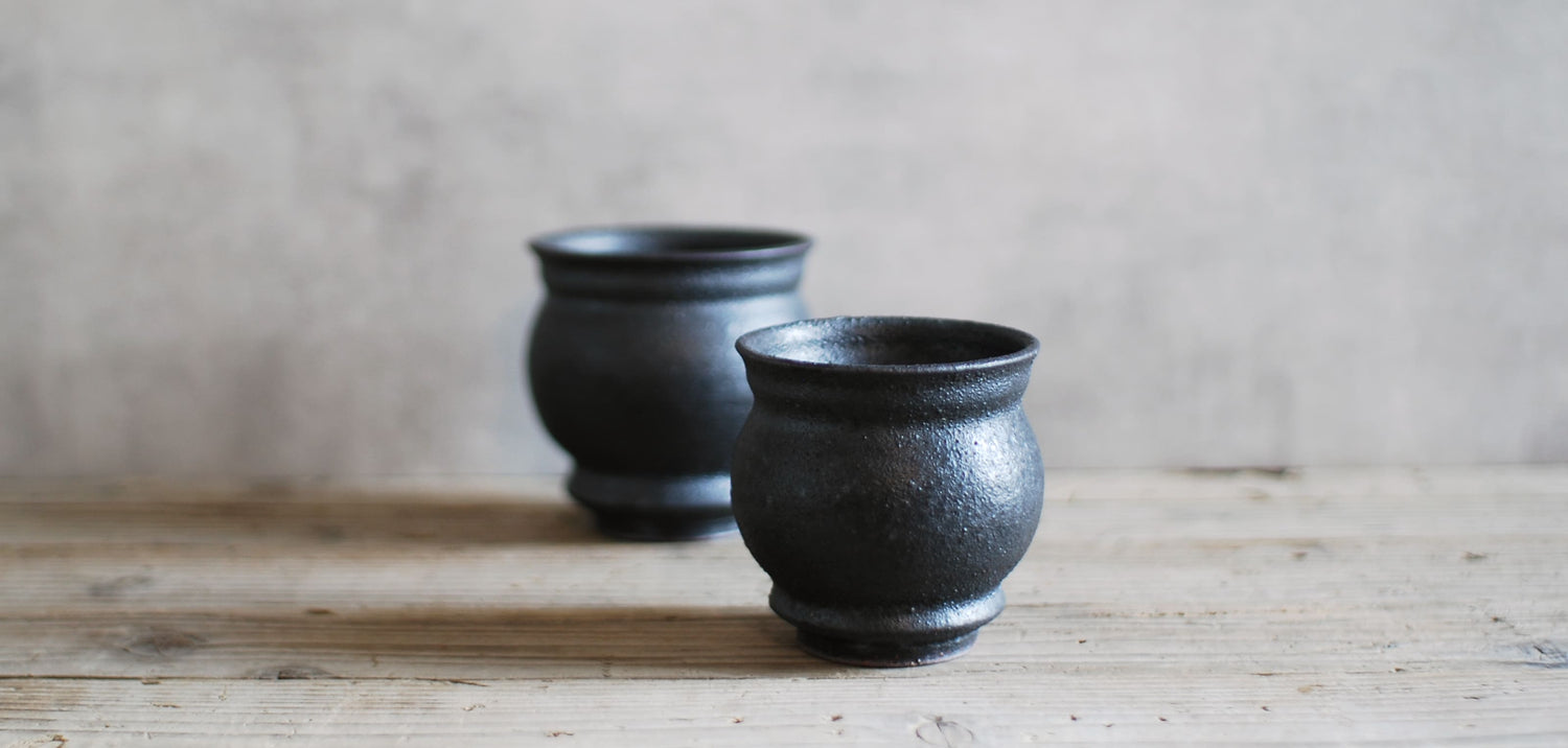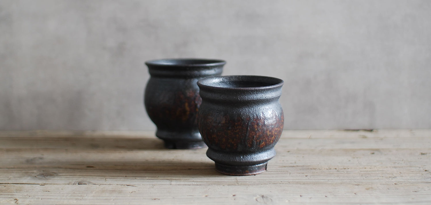 草津の土に独自配合の草津の泥を上掛けし、さらに霧吹きで泥を吹き付け、濃淡を描く製法。唯一無二の発色と質感を表現。表面には結晶化した鉄分が独特の光沢をもたらします。