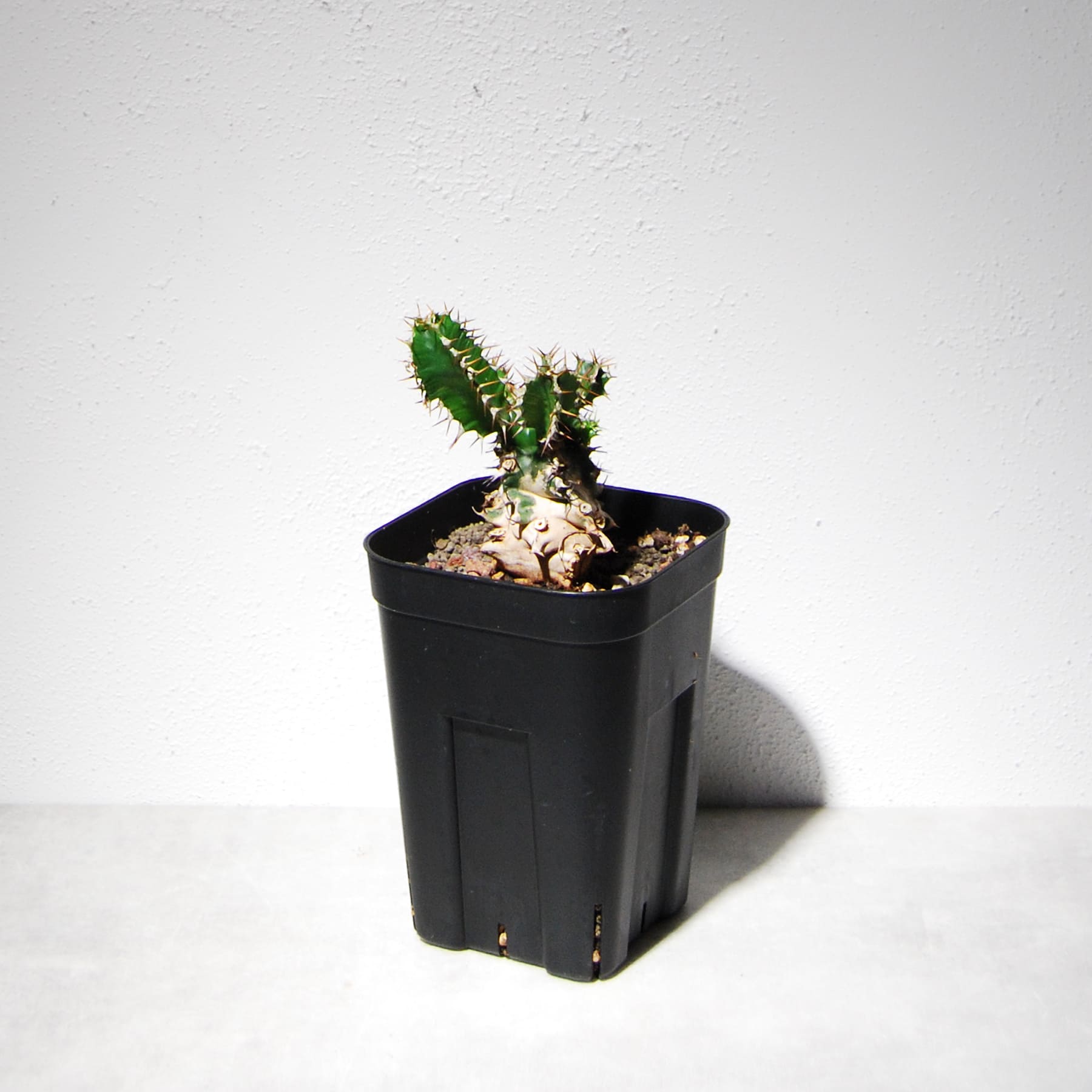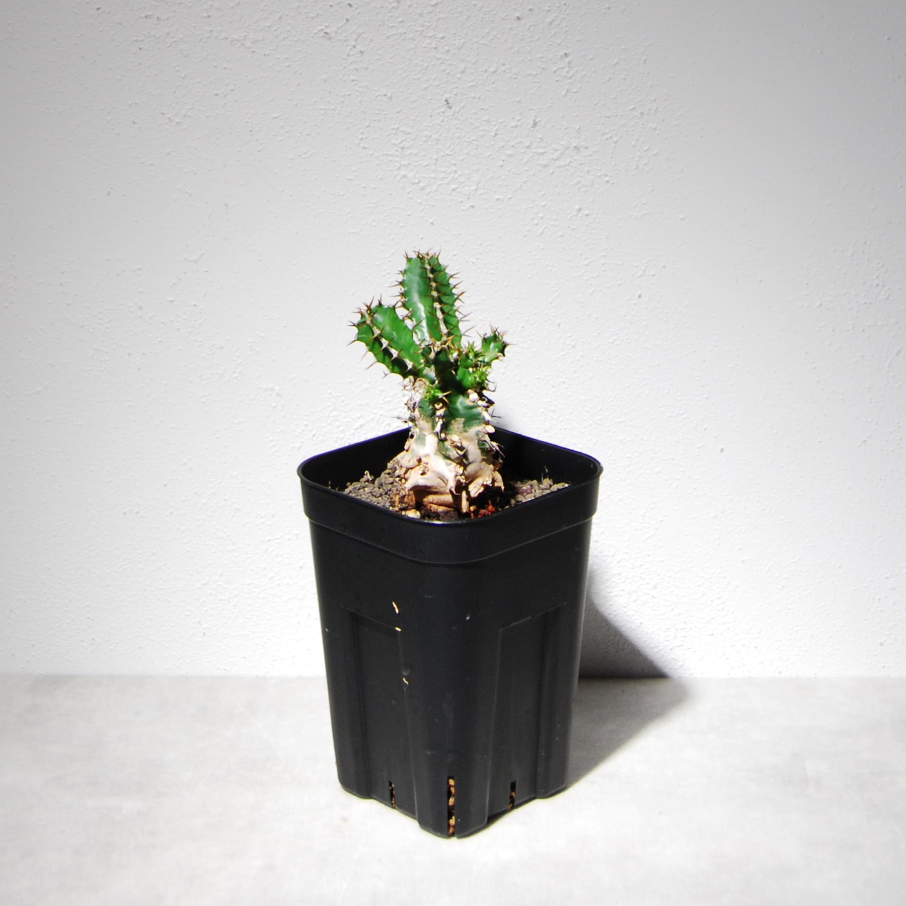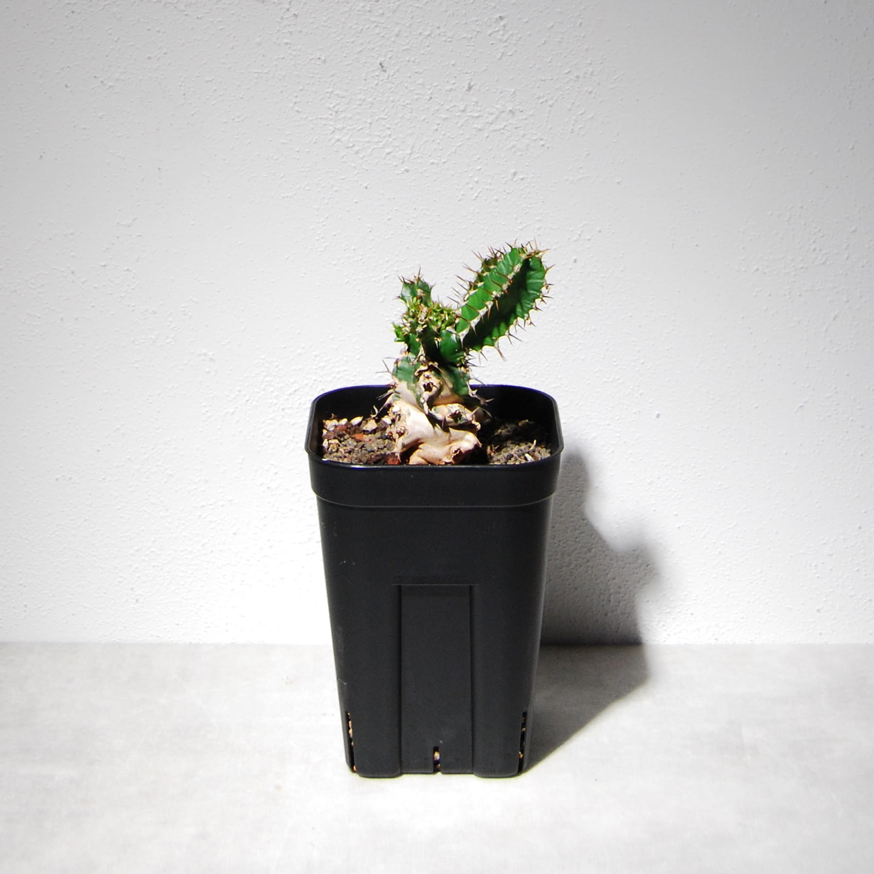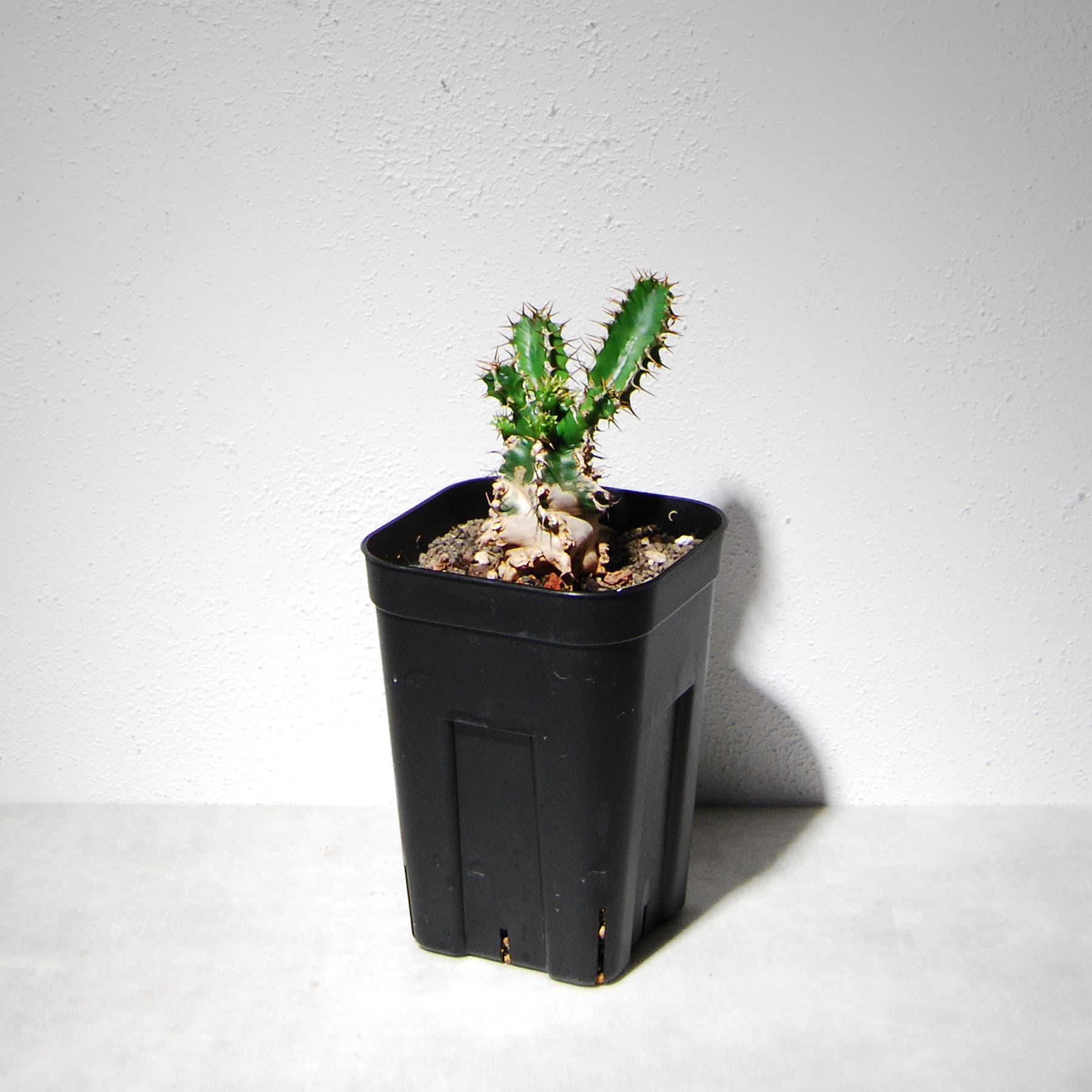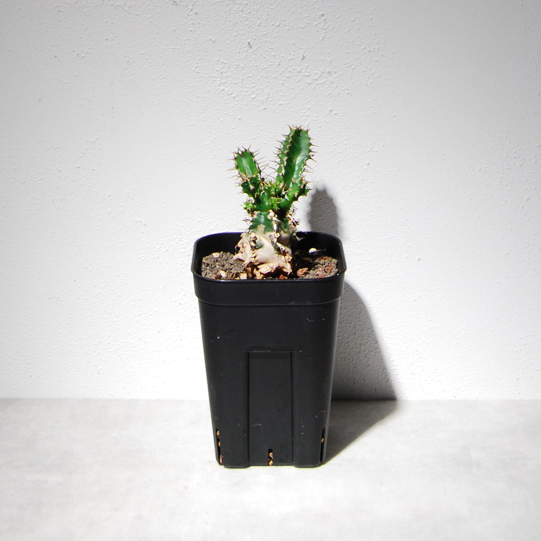 南アフリカ・東アフリカの標高の高い地域に自生するボコボコした太い塊根部が特徴のユーフォルビアです。その特徴のある塊根部は葉が枯れた痕が残り、独特の雰囲気と迫力があります。多肉質で太い緑色の葉にはトゲがあり葉が展開して充実するとさらに迫力が増します。
