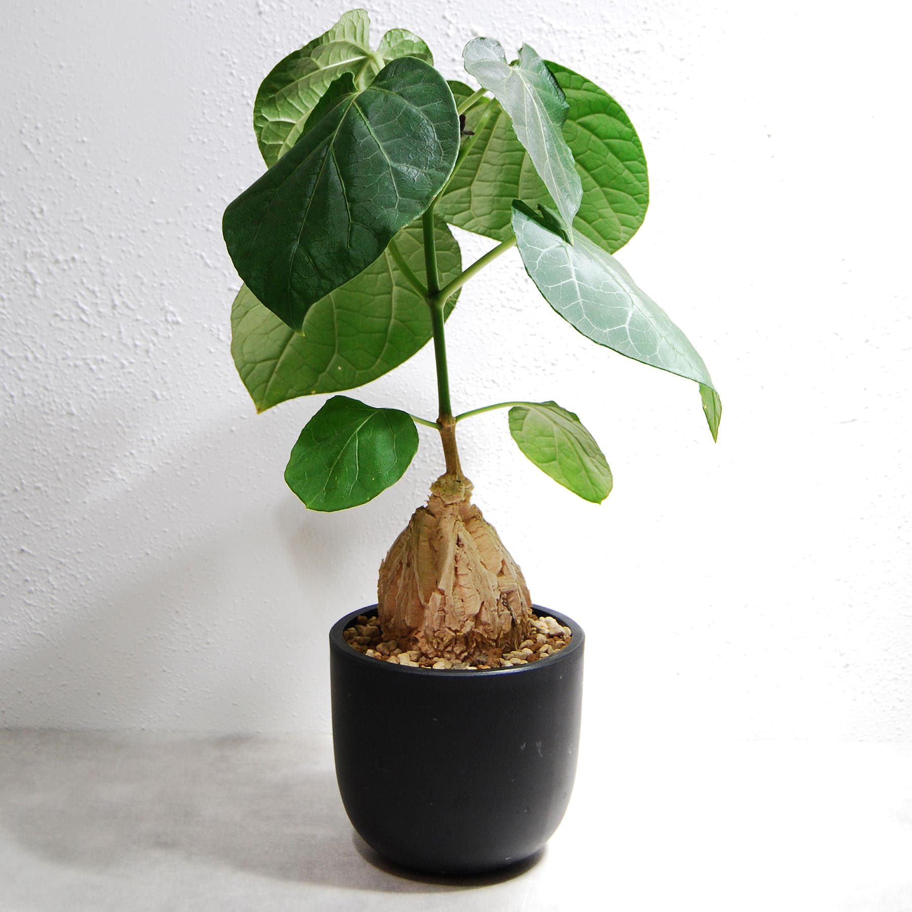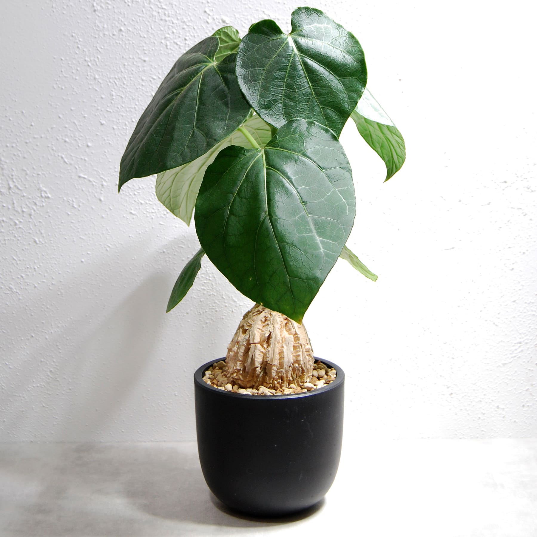 大きくヒビ割れたコルクのような質感の塊根が特徴で、生育期は塊根からツル状の枝を伸ばし、そこから大きなハート型の葉を展開します。